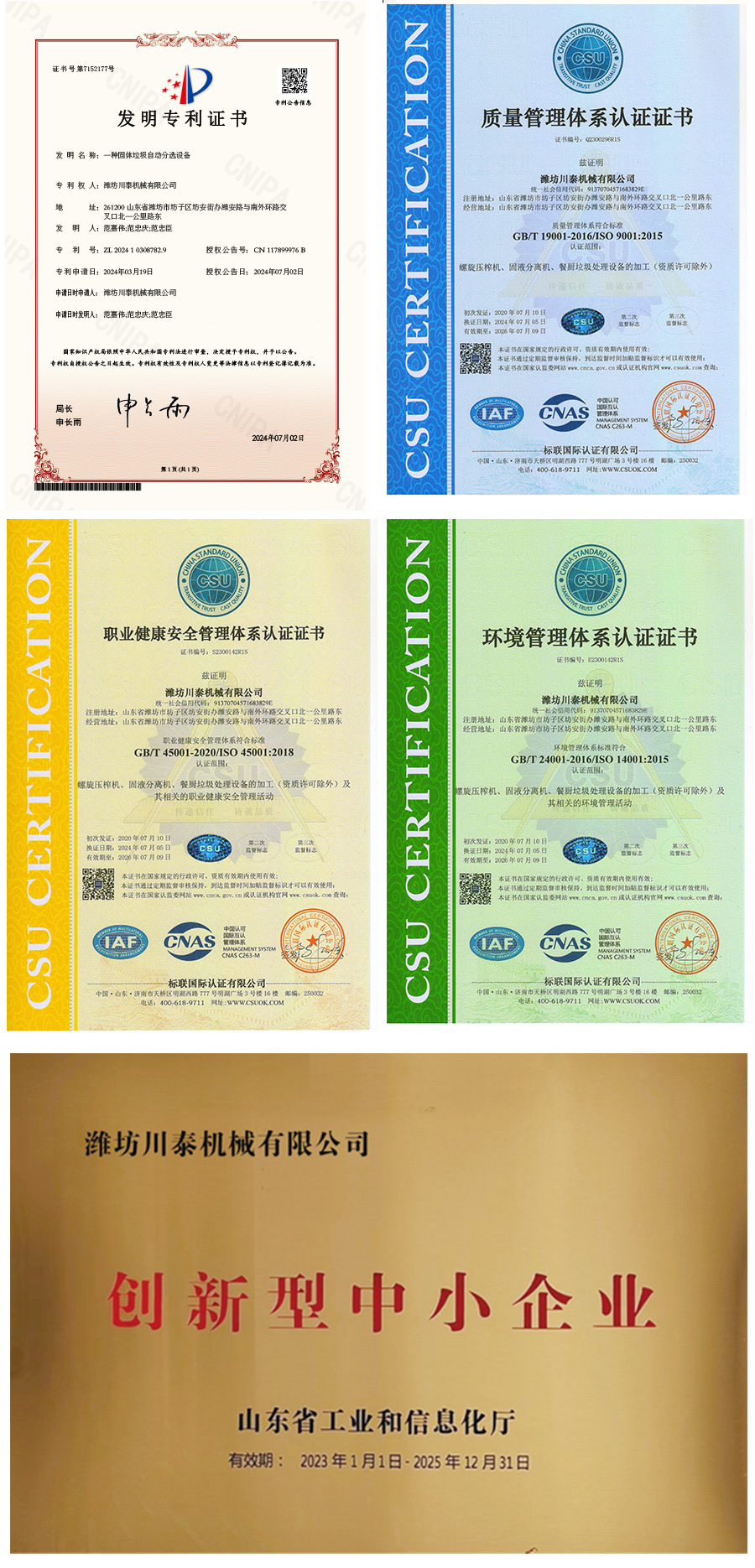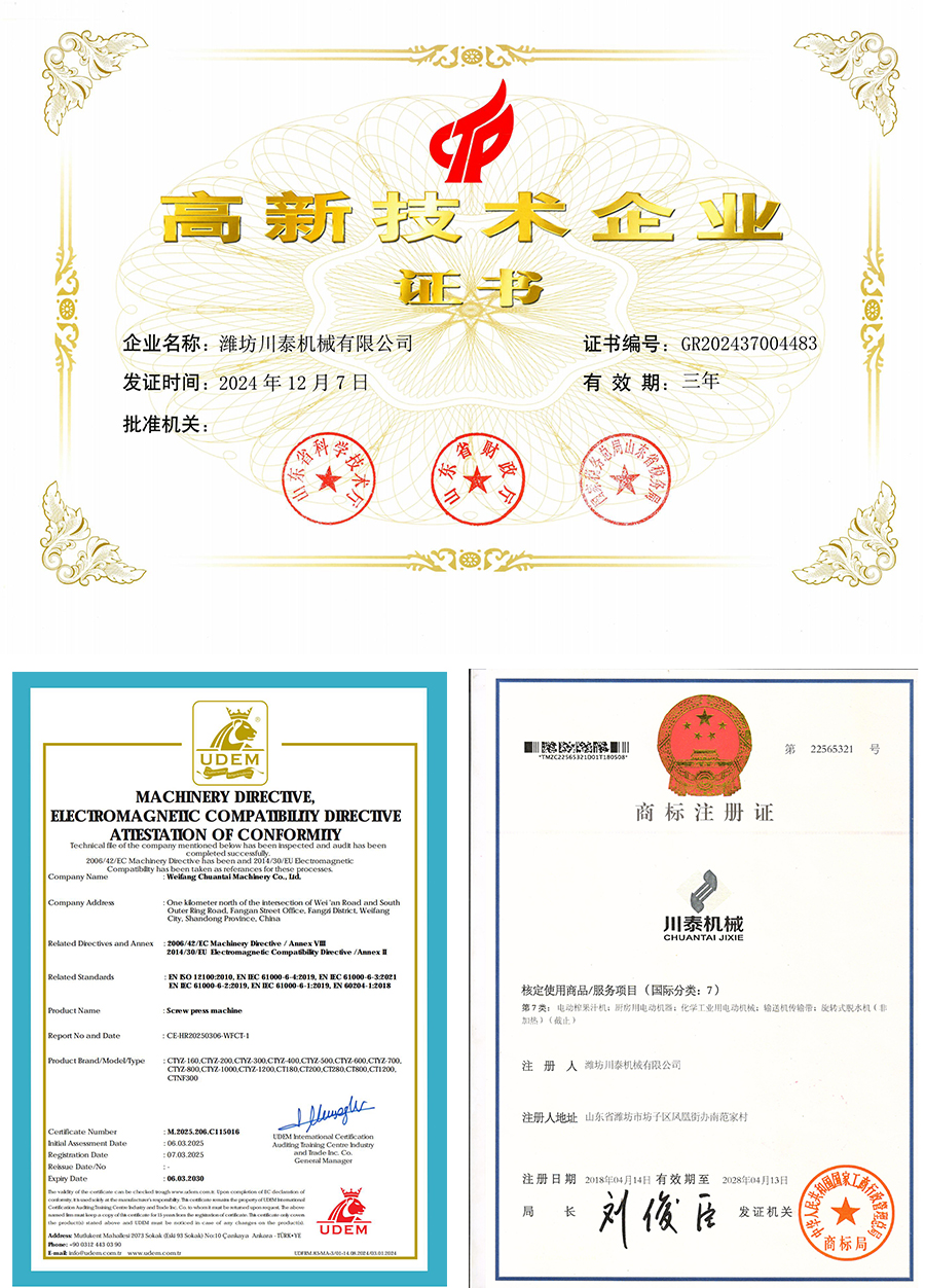 潍坊川泰机械有限公司成立于2011年,高新技术企业,科技型企业,创新型企业,通过了ISO9001质量管理体系认证、ISO14001环境管理体系认证、OHSAS18001职业健康安全管理体系认证,CE证书,1项发明专利,33项实用新型专利,注册商标,有出口资质,多次中标记录。